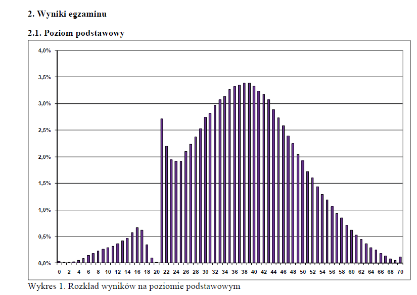 Na poniższym wykresie wyniki matury z polskiego (rok 2010). To oczywiście znana sprawa i pewnie sporo osób ten wykres widziało. Jeśli nie, to pięknie pokazuje on, jak naciągano wyniki, by więcej osób zaliczyło (trzeba było otrzymać co najmniej 30% punktów, w tym przypadku 21).