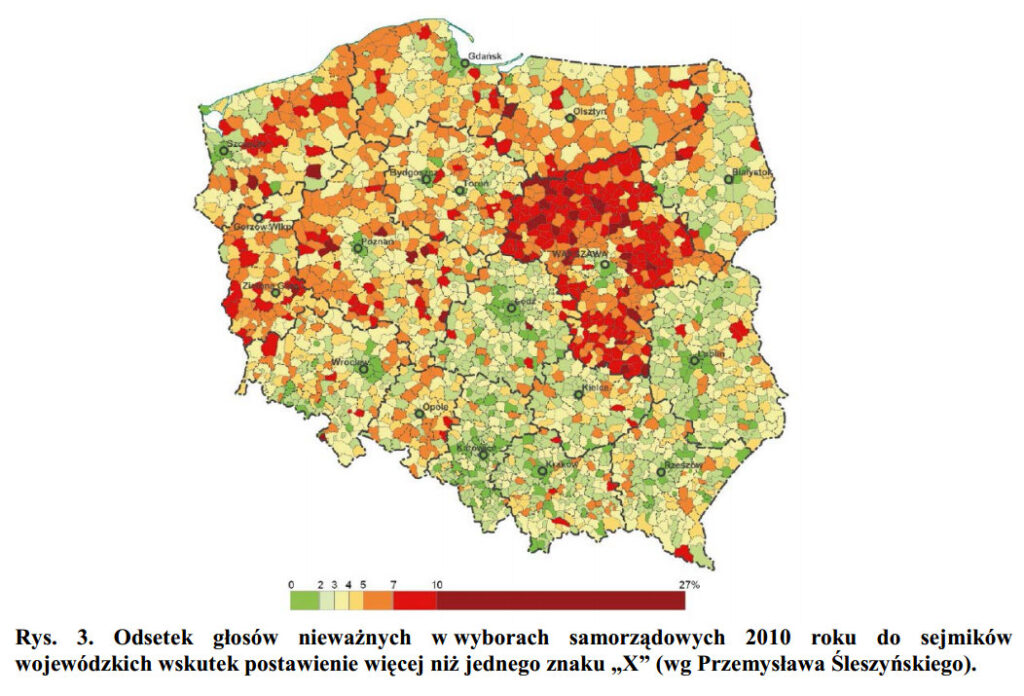 Spójrzmy na załączoną mapkę. Kolorem przedstawiono procent nieważnych głosów w wyborach samorządowych (2010), w wyniku postawienia co najmniej dwóch krzyżyków (czyli to nie są wszystkie nieważne głosy).