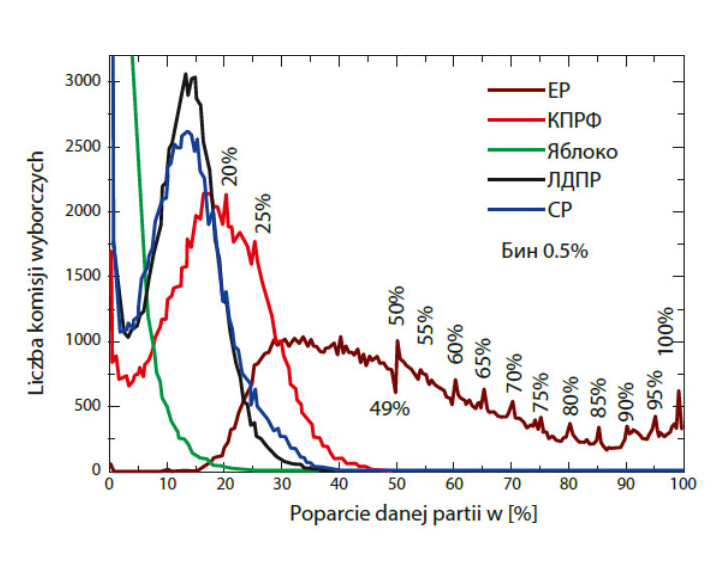 Tak, jest to dość specyficzne przedstawienie wyników wyborów. Natomiast podobnie jak z maturami, tu również należy oczekiwać pewnej gładkości. Jeśli partia otrzymała 42% w 1000 komisji, to w podobnej liczbie komisji powinna otrzymać 41% i 43%. Z jakiegoś tajemniczego powodu jest jednak inaczej. „Okrągłe” liczby (wielokrotności 5%) pojawiają się częściej. Bardzo charakterystyczne jest też maksimum lokalne dla 50% i minimum dla 49%.