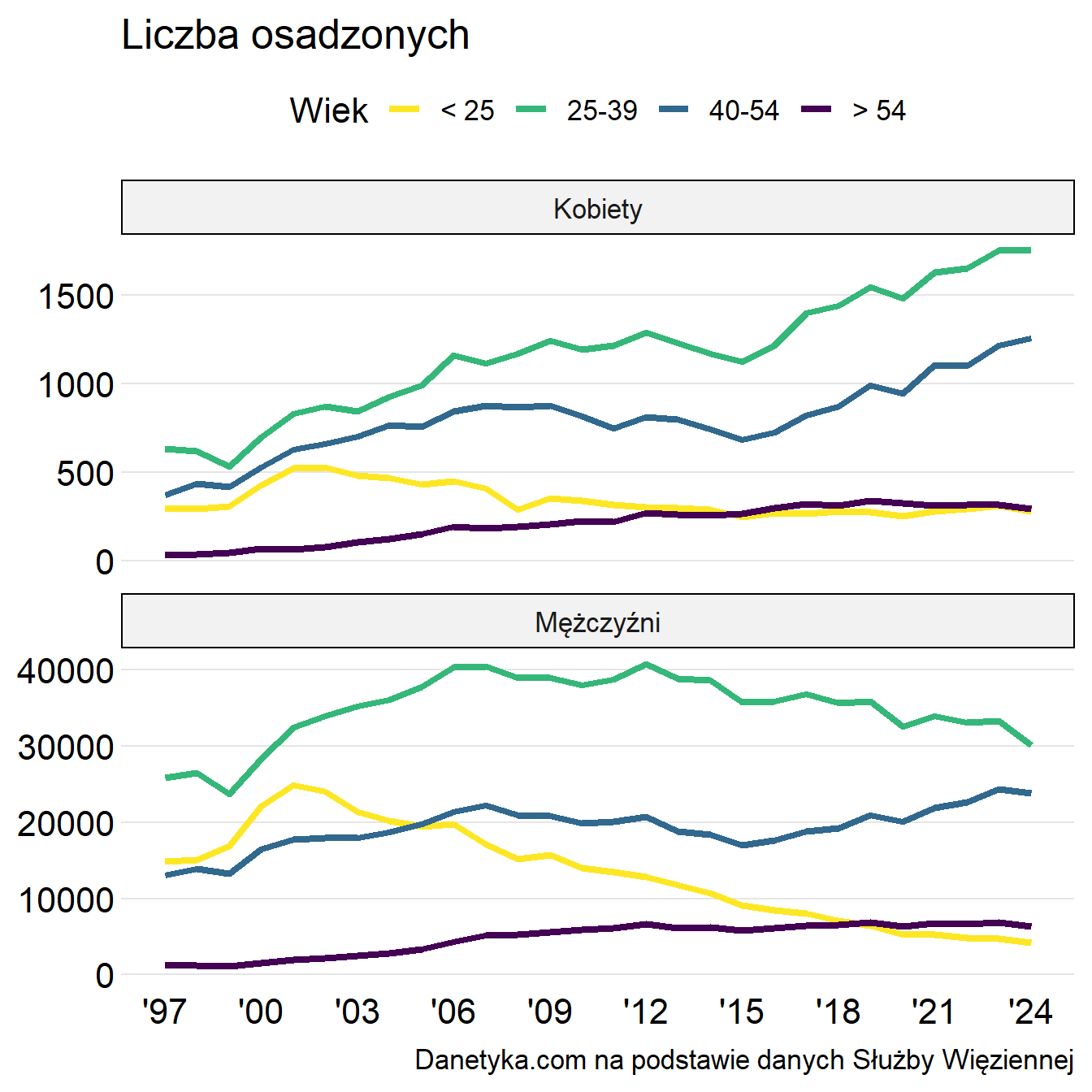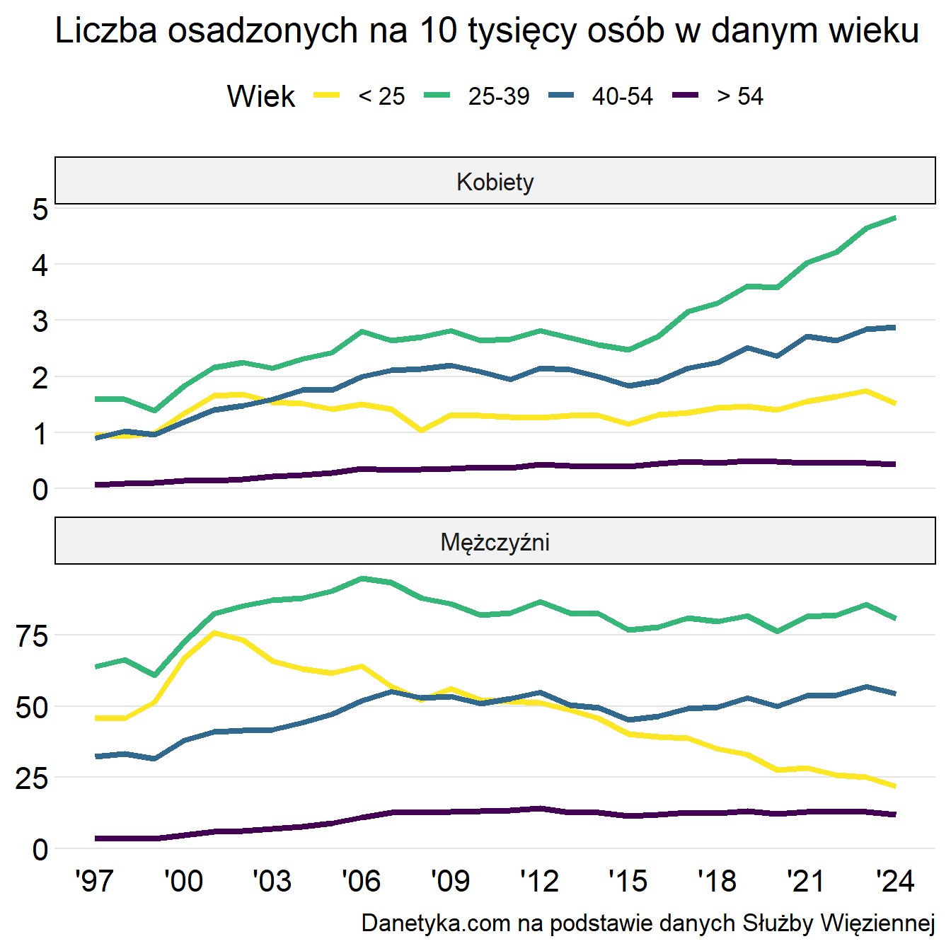 Interpretując ten wykres, pamiętajmy, że jeśli ktoś przebywa w więzieniu wiele lat, to przechodzi z jednej kategorii w drugą (część osadzonych w wieku poniżej 25 lat “przeszła” do kategorii 25-39). Z danych nie da się odczytać, w jakim wieku był osadzony, gdy trafił do więzienia.