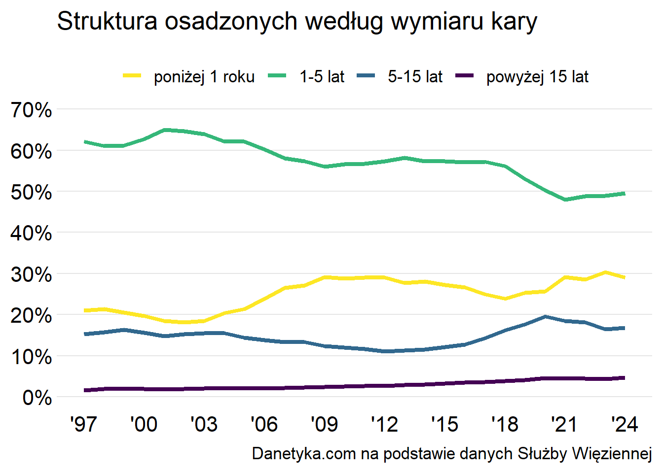 Uwaga: z tych danych nie wynika, na jakie kary są najczęściej skazywani więźniowie, ale jest to obraz osadzonych w danym momencie (więźniowie skazani na krótsze okresy szybciej opuszczają więzienia, więc w pewnym sensie jest ich mniej w danym przekroju czasowym). Oprócz tego zdefiniowane przeze mnie przedziały lat są dość arbitralne i ich długość wplywa na proporcje. Mimo wszystko, patrząc na wykres, można postawić tezę, że coraz częstsze są kary poniżej 1 roku, “zamiast” kar 1-5 lat.