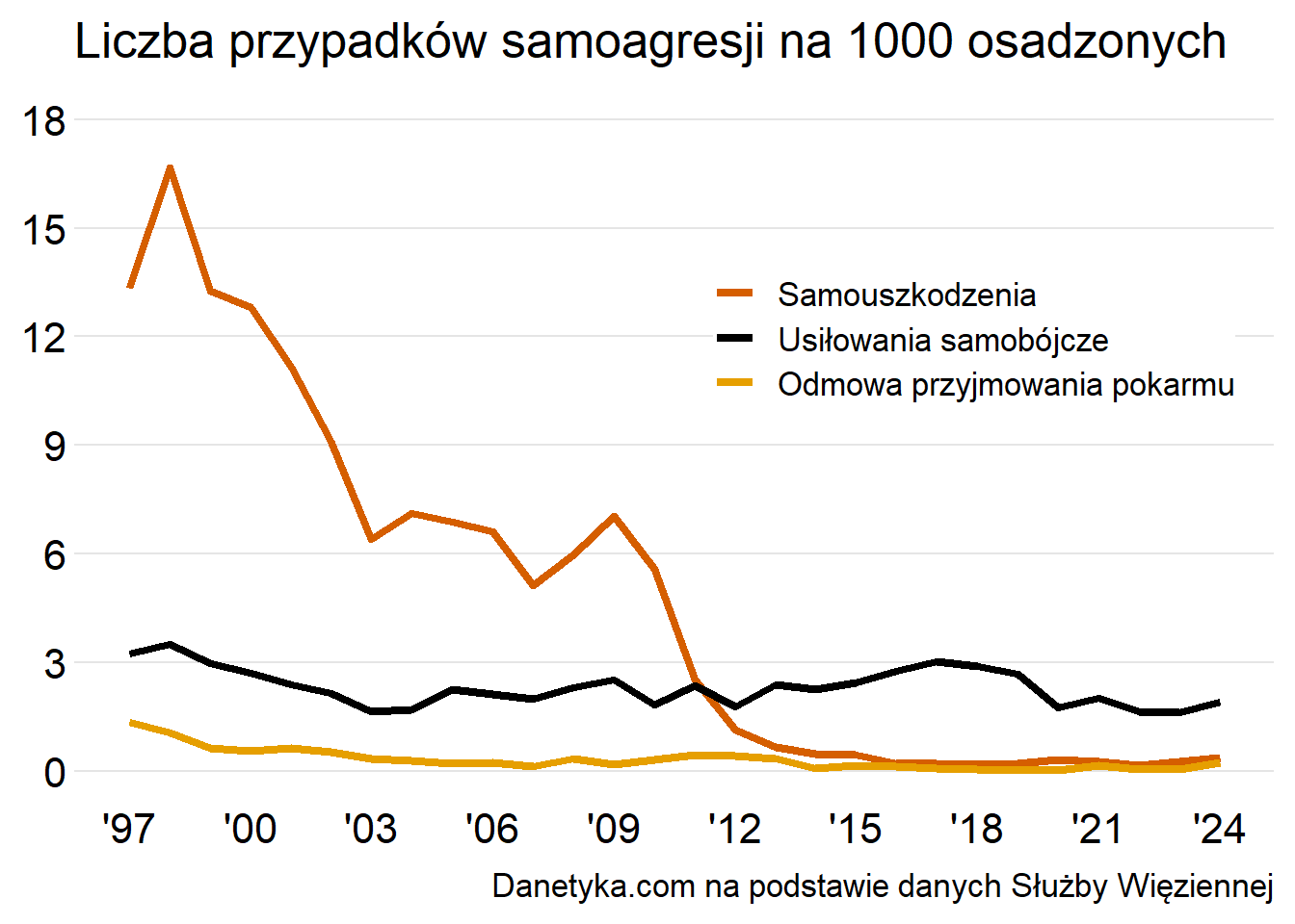 Ponieważ liczba osadzonych w różnych latach jest dość podobna, możemy też analizować bezwzględne liczby. I tak, w latach 1997-2001 odnotowano rocznie średnio 843 przypadki samouszkodzeń, 52 odmów przyjmowania pokarmu i 185 razy usiłowano popełnić samobójstwo. Z kolei w latach 2020-2024 było średnio 19 przypadków samouszkodzeń, 7 odmów przyjmowania pokarmu i 126 razy usiłowano popełnić samobójstwo. W danych brak informacji o wieku i płci osób dokonujących samoagresji.