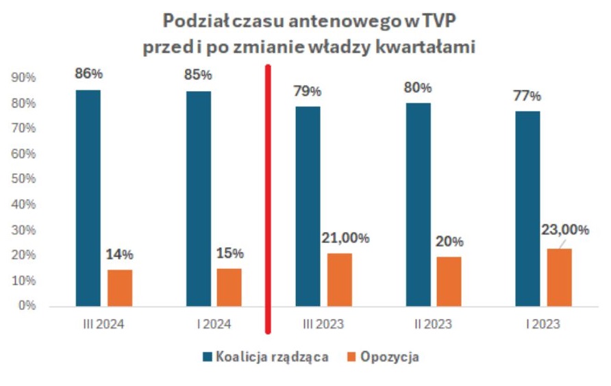 Czas na tym wykresie biegnie w lewą stronę, co łatwo przeoczyć. Brakuje niektórych kwartałów i niestety nie zostaliśmy przed tym odpowiednio ostrzeżeni. Jest tu też pewien problem z kategoriami „opozycja” i „koalicja rządząca”, gdyż należą do nich inne partie po lewej i po prawej stronie wykresu. Oczywiście można było tak do tego podejść, ale popatrzmy na poniższy wykres.