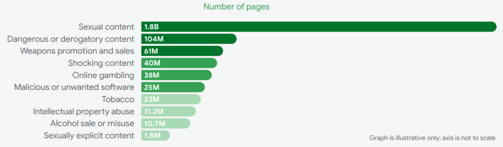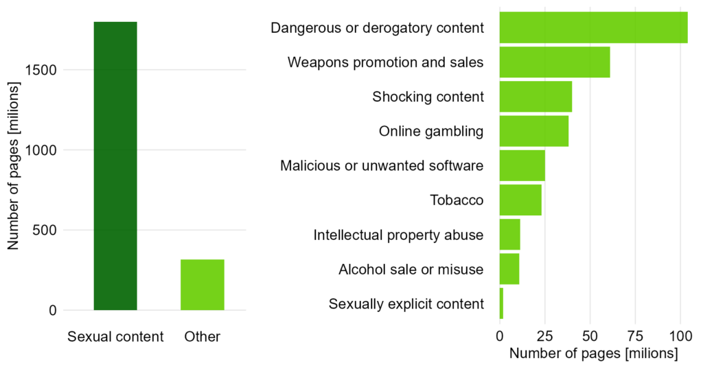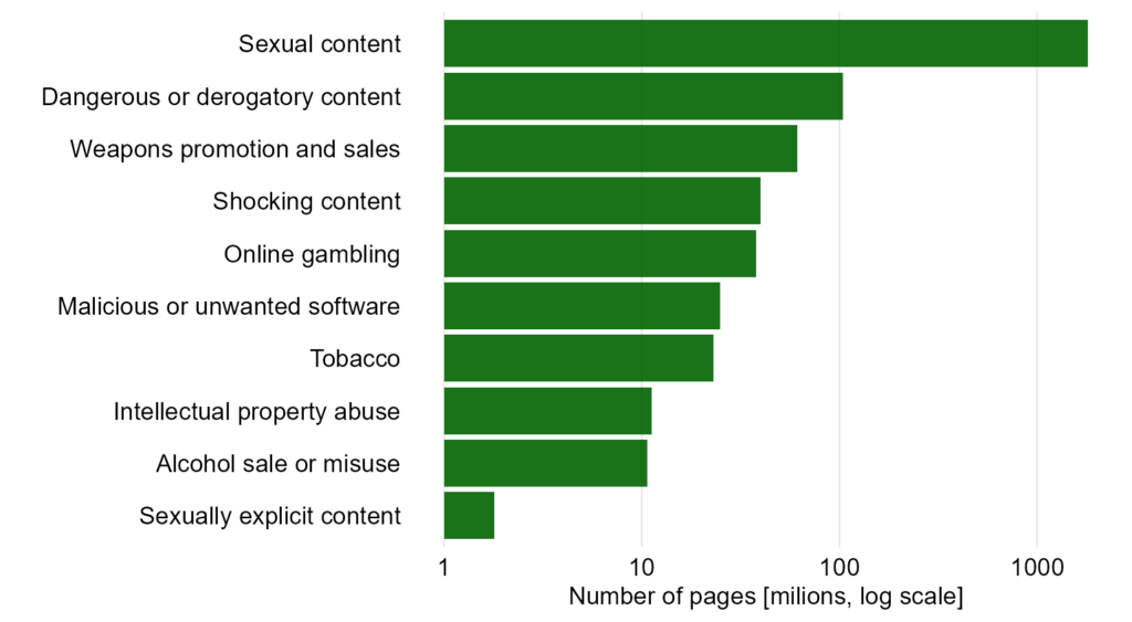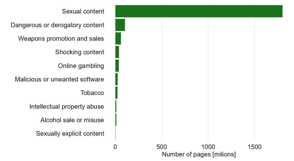 Oprócz tego mamy tu niepotrzebny gradient. Dlaczego „Tobacco” (23M) jest znacznie jaśniejsze od „Malicious or unwanted software” (25M), skoro różnica w liczbach jest minimalna? Mylące może być też to, że wszystkie wartości są podane w milionach (M) poza pierwszą kategorią (B).