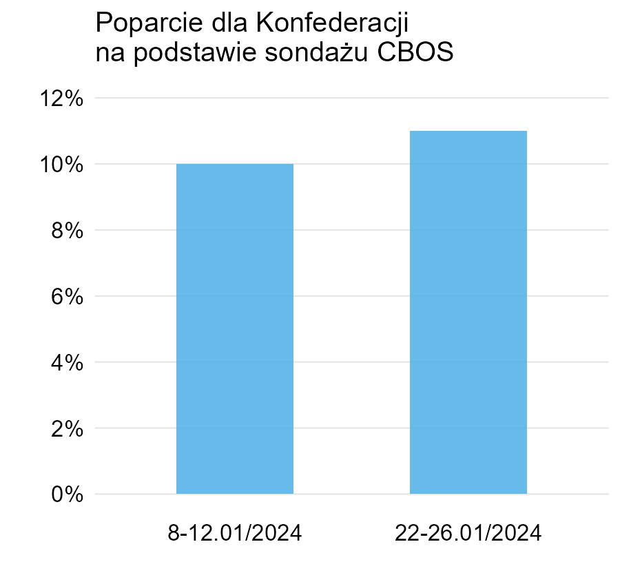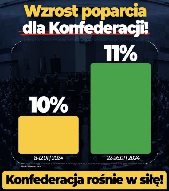 Mimo minimalnej różnicy drugi słupek jest ponad dwukrotnie wyższy. Oprócz tego kolor zmienia się z żółtego na zielony (to nie jest przypadek). Ogólnie znów mamy tu problem z osią Y, która nie zaczyna się w zerze, natomiast warto jeszcze zauważyć, że jest to sondaż wyborczy, więc podane wartości to nie jest poparcie, ale jej szacunek. Co więcej, dla 1000 obserwacji (a to jest typowa próba dla sondaży) błąd standardowy dla szacowania proporcji 10% wynosi około 1% (ten błąd zależy od rzeczywistej proporcji!), czyli właśnie tyle, ile wynosi różnica między tymi sondażami. Stąd można się zastanawiać, na ile tytuł jest poprawny.