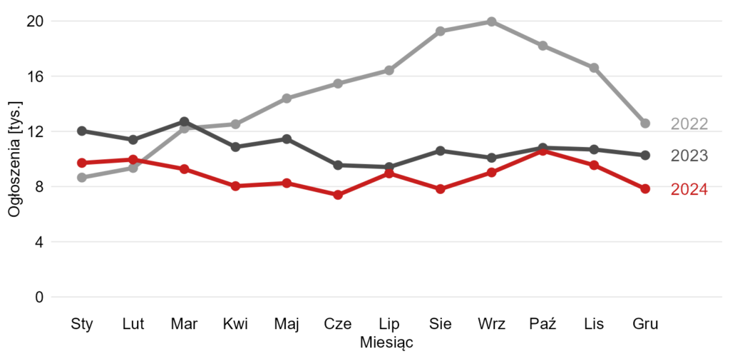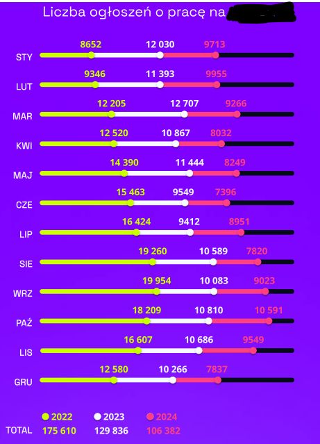 Wykres w takiej formie wydaje się całkowicie bezużyteczny. Ciężko też powiedzieć, co było tutaj celem, w każdym razie jedyne, co widać, to jak zmieniała się liczba ogłoszeń w roku 2022 (żółte słupki) oraz jaka jest suma ogłoszeń z lat 2022-24 dla każdego miesiąca (?). Także widać tutaj okresowość (związek z miesiącem), ale ciężko przypuszczać, żeby o to chodziło (tzn. takie rzeczy też są interesujące, ale bada się je inaczej). Dodatkowo mamy mylący czarny słupek, który sugeruje, że jest jakaś całkowita możliwa liczba ogłoszeń.