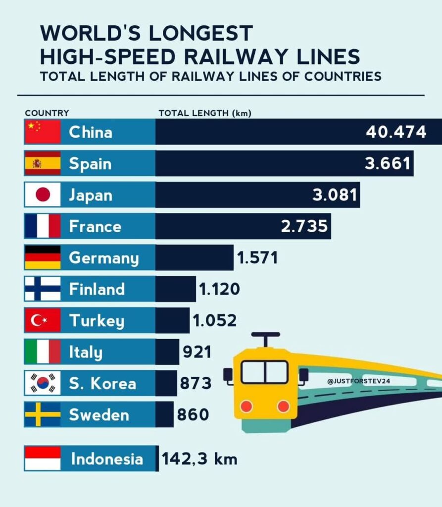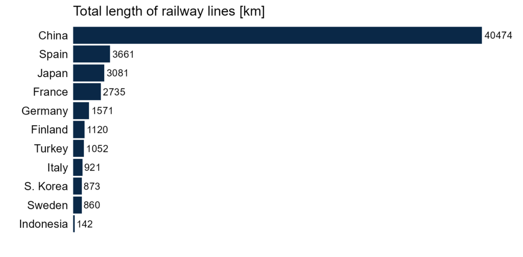 Długość linii kolejowych w Chinach jest największa, choć w Hiszpanii jest ich niewiele mniej, mimo że kraj ma znacznie mniejszą powierzchnię! A nie, czekaj…