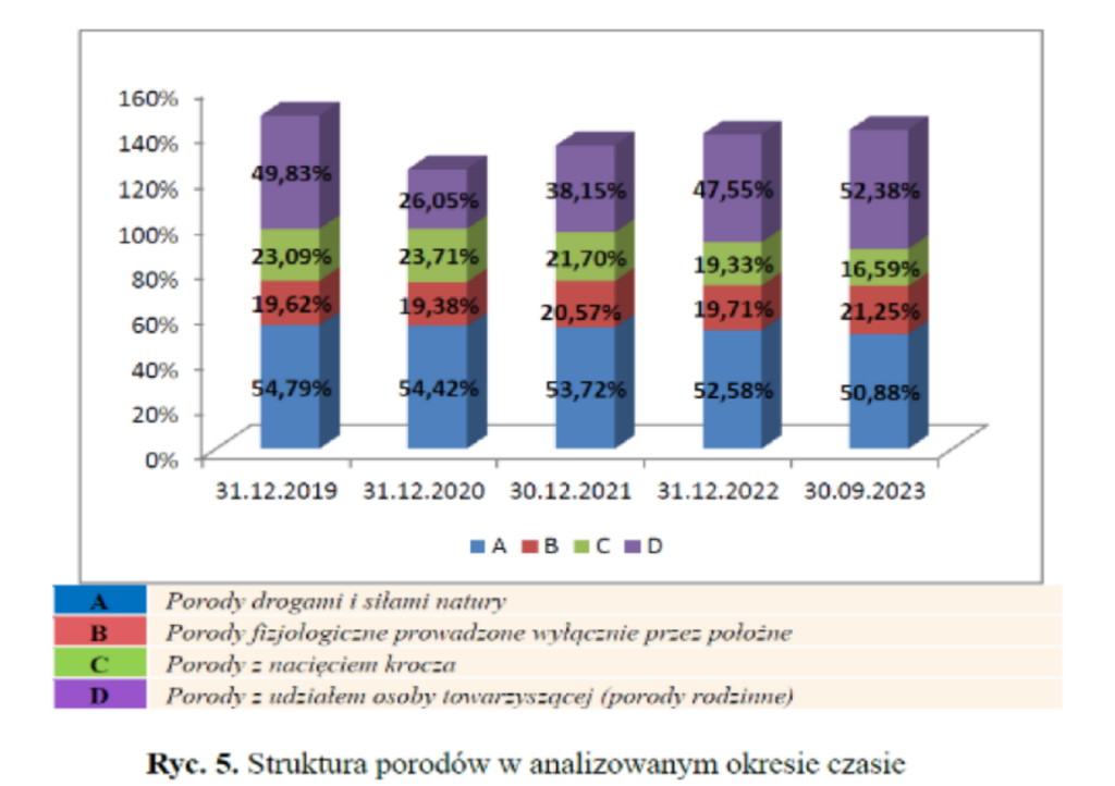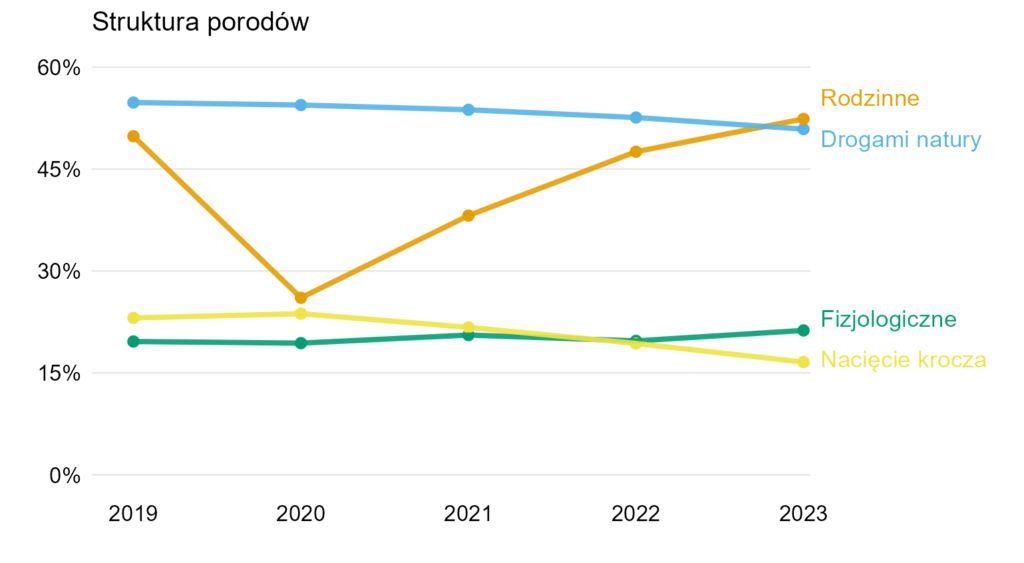 Teraz bardzo dobrze widać, jak spadła liczba porodów rodzinnych (COVID), ale w 2023 roku wróciła do stanu z 2019 (a nawet jest ich trochę więcej).