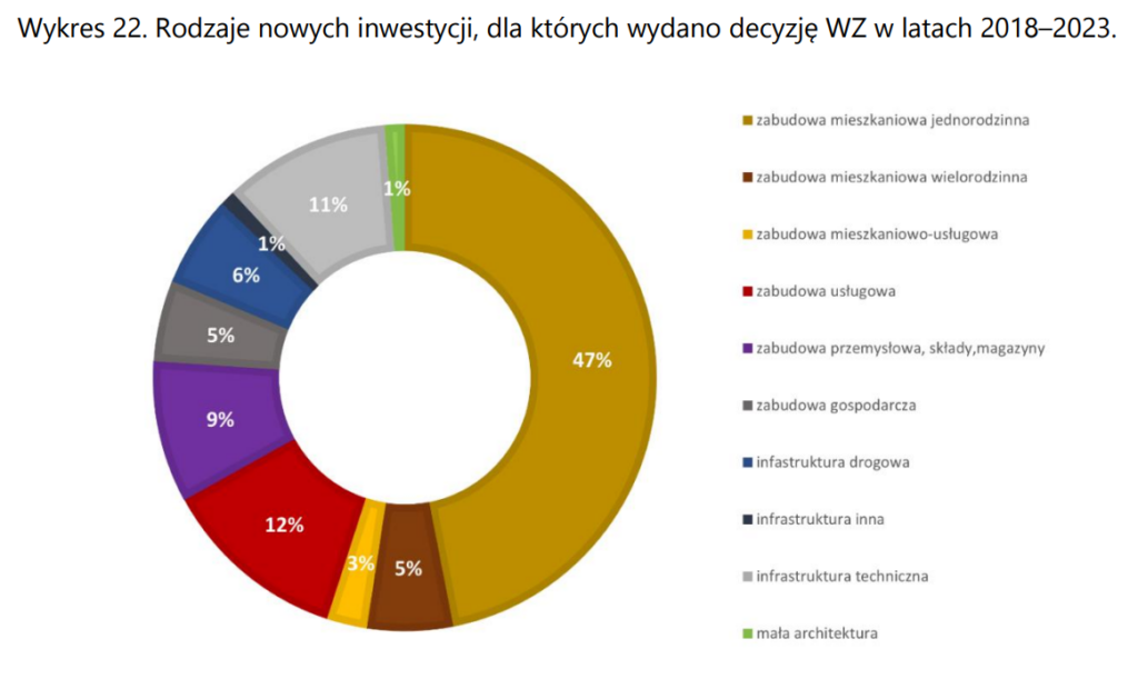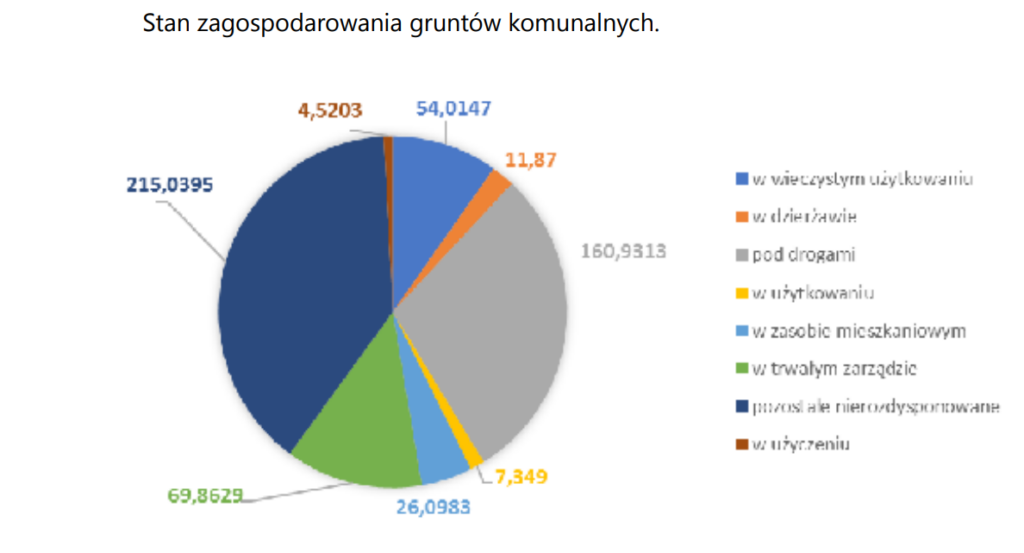Zacznijmy od tego, że mamy tu przedstawione powierzchnie (w hektarach – niestety trzeba się tego domyślić, szczególnie że na wykresie kołowym podaje się zwykle procenty), przez co użycie wykresu kołowego dałoby się obronić. Ciężko jednak usprawiedliwić to wykonanie. Zacznijmy od tego, że odczytanie etykiet to nie lada sztuka – a w takiej formie wykres pojawił się w raporcie. Dobór kolorów i kolejność kategorii wydają się zupełnie losowe. Liczby podane z dokładnością do czterech miejsc po przecinku (to oczywiście szczegół).