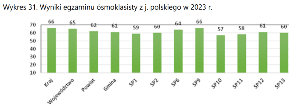 Ciekawy przykład, w który jest problem zarówno z początkiem osi Y, jak i z końcem. Oprócz tego nie jest jasne, czym są podane liczby (są to procenty). Z jakiegoś powodu ktoś wpadł na pomysł, żeby zacząć wykres od 10% (?). Od razu trzeba sobie powiedzieć, że ma to minimalny wpływ na percepcję, ale ciężko nie zadać sobie pytania „dlaczego?!” Wykres kończy się na 70%, natomiast czarna pozioma linia sugeruje, jakby to była maksymalna liczba punktów (szczególnie że nie widać, że są to procenty). Cztery pierwsze kategorie stanowią pewną referencję (jak wynik w podanych szkołach ma się np. do ogólnopolskich), więc warto by wyraźniej to zaznaczyć. Plus problemy estetyczne (linia przecina niektóre etykiety).