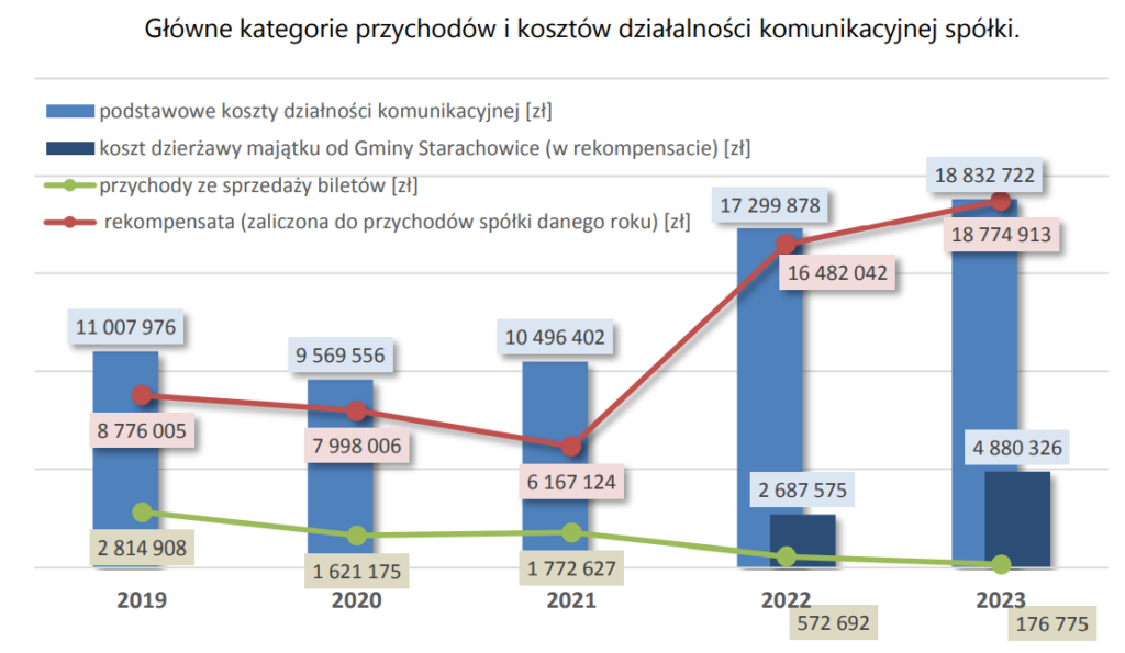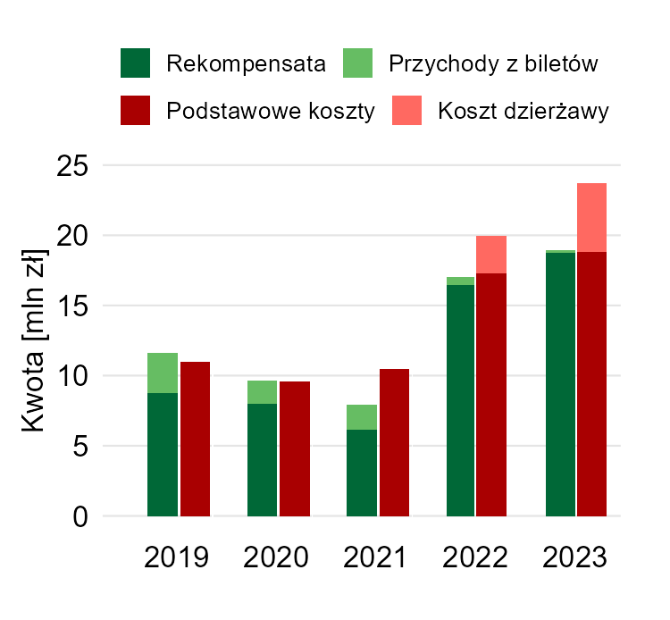 Dużo czasu trzeba spędzić, żeby odczytać ten wykres. Mamy tutaj przychody i koszty, podzielone na dwie kategorie. Przychody pokazane przy pomocy wykresu liniowego, koszty słupkowego. Takie mieszanie rodzajów wykresów rzadko kiedy jest dobrym pomysłem. Można było albo zrobić dwa osobne, ewentualnie poniżej moja wersja (być może warto było jeszcze wyraźnie zaznaczyć różnicę między przechodami a kosztami).