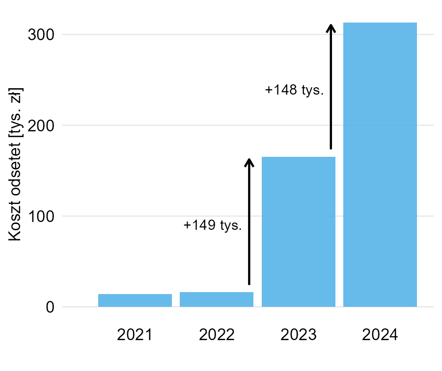 Ogólnie ciężko powiedzieć, o co tutaj chodziło. Wyobrażam sobie, że w jakimś konkretnym przypadku w pierwszej kolejności ważne mogą być różnice w koszcie odsetek rok do roku, ale w drugiej kolejności chcielibyśmy zobaczyć, ile one dokładnie wynoszą (co do grosza…). Jeśli byłby to wykres w wewnętrznym raporcie technicznym (dla analityków, którzy są do niego przyzwyczajeni), dałoby się to obronić. Ale jego cel miał być prezentacyjny.