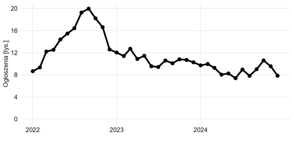 Natomiast wydaje się, że najważniejsze wnioski, które można wyciągnąć z tych danych, to po prostu jak zmieniała się liczba ogłoszeń z czasem. Dlatego poniżej najprostsze rozwiązanie.