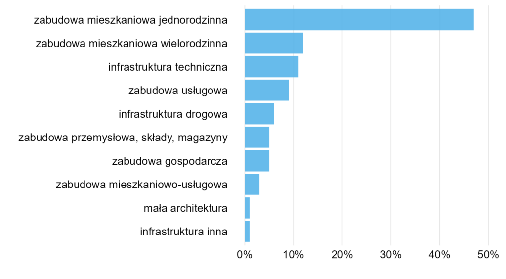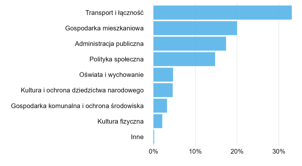 Zaczynamy od klasyki, czyli wykresu kołowego, na dodatek w swej najgorszej odsłonie, czyli 3D. Ciężko wybrać gorszy sposób prezentacji takich danych. Spójrzmy na przykład na kategorie „Gospodarka mieszkaniowa” i „Administracja publiczna”. Mimo że różnice nie są duże (20% vs. 17%), na wykresie ta pierwsza kategoria zajmuje znacznie więcej miejsca (porównajmy z wykresem słupkowym poniżej).