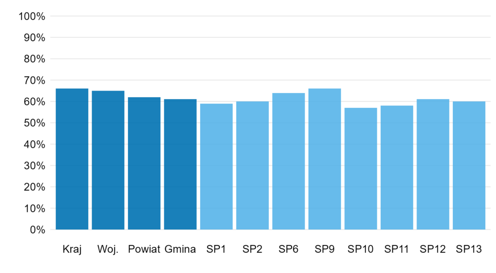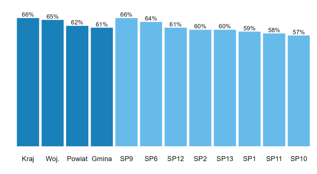 Natomiast niekoniecznie jest to najlepsze podejście. Różnica między najlepszą i najgorszą szkołą to 9 p.p. i możemy uznać, że jest to znaczące (to nie znaczy, że ma to być czysto subiektywna decyzja, ale może wynikać z głębszej analizy wyników dla całej Polski). Dlatego poniżej zrezygnowałem z osi Y aż do 100% i wyraźnie podałem wyniki nad słupkami (wtedy sama oś jest zbędna). Dodatkowo posortowałem wyniki dla szkół, ale nie twierdzę, że tak jest najlepiej. Szkoły mają swoją numery, więc jest tu pewna „naturalna” kolejność i może być warto trzymać się jej – szczególnie jeśli jest to jeden z wielu wykresów dla tych szkół.