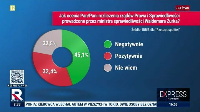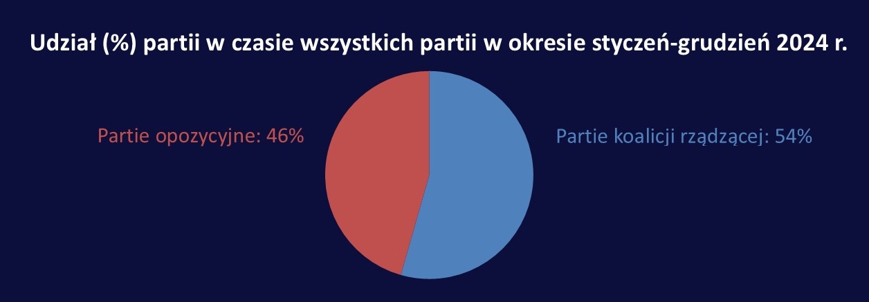 - „Dane TVP za okres od stycznia do grudnia 2024 r. pokazują, że w jej programach na partie koalicji rządzącej przypadło 54 procent czasu antenowego, na partie opozycyjne — 46 procent” (wirtualnemedia.pl)