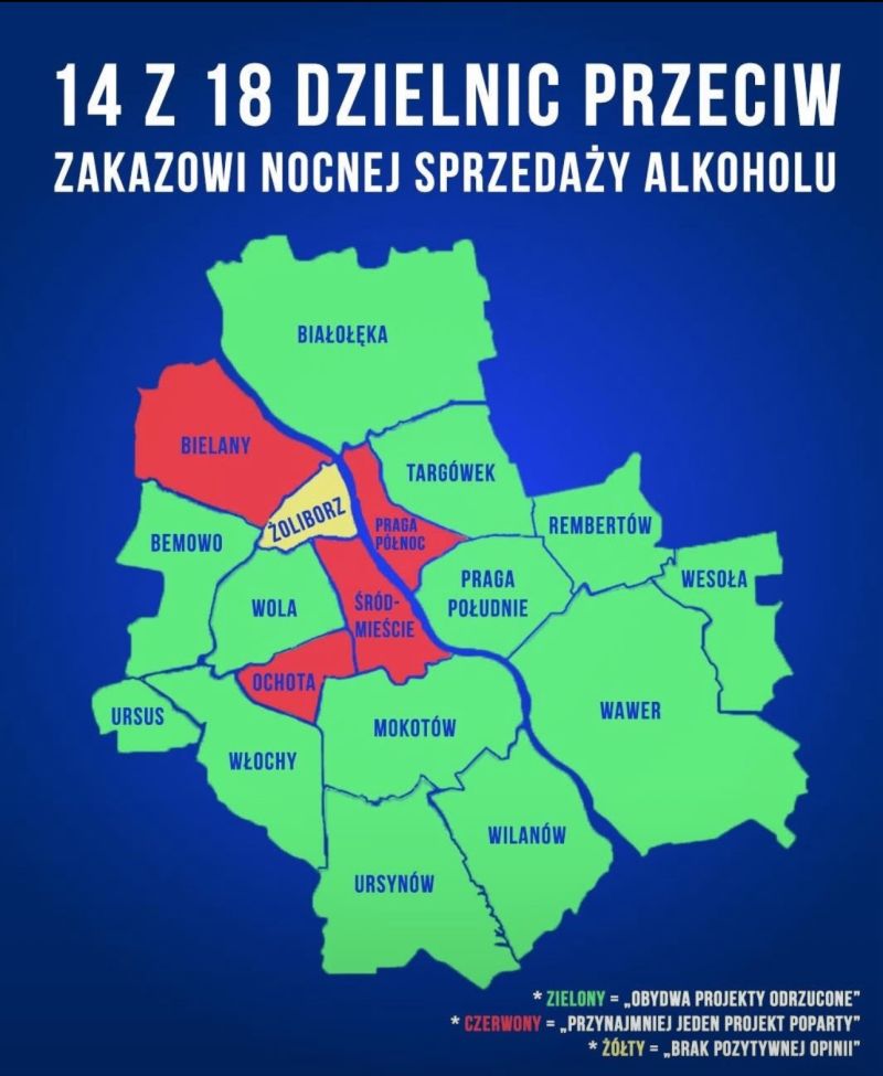 Kolejny przykład z interesującą kolorystyką. Mamy dobre i złe dzielnice Warszawy, gdzie dobre to te, które zagłosowały przeciw nocnej sprzedaży alkoholu.