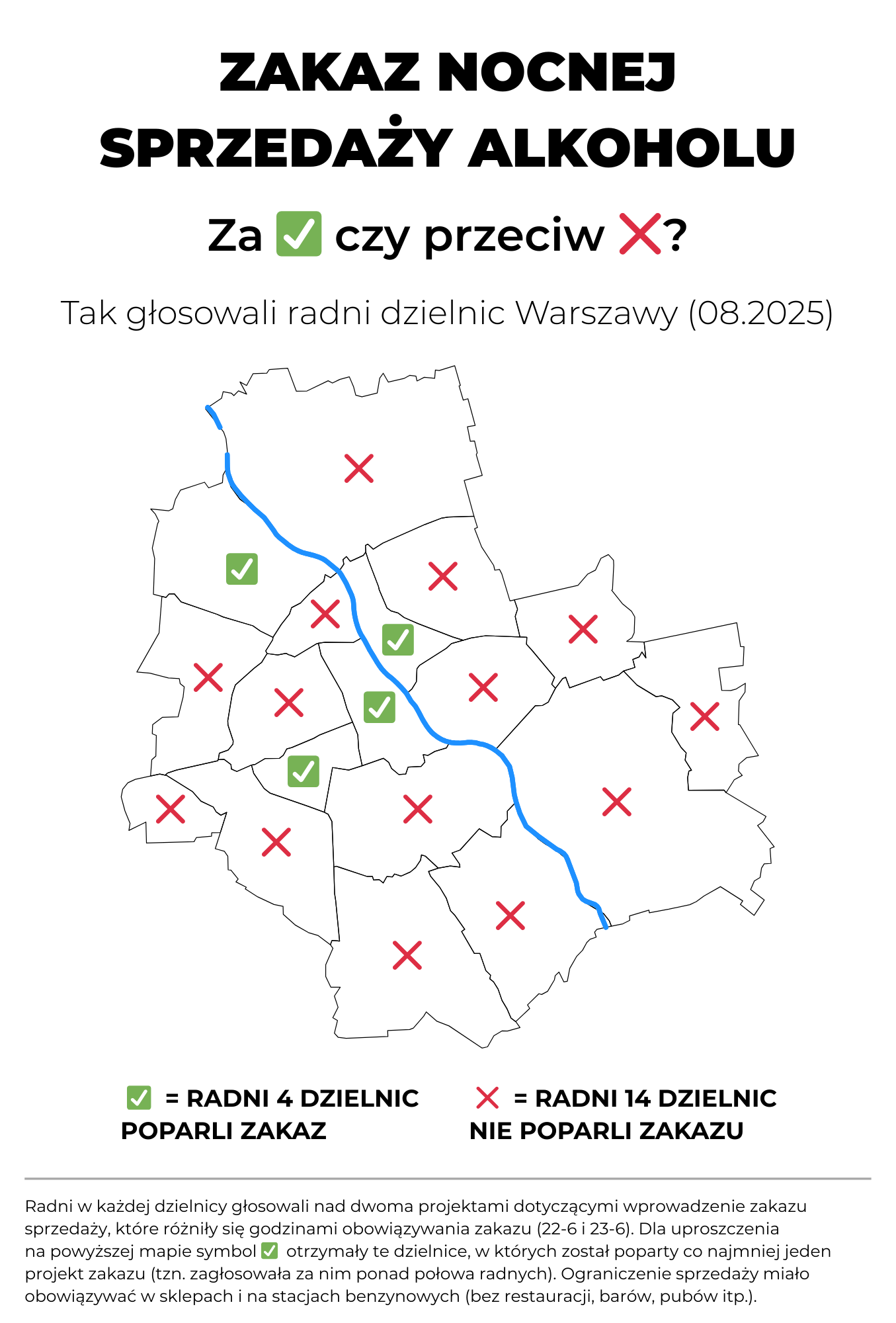 A tak swoją drogą, to w jaki sposób te dzielnice głosowały? Wykonano badanie opinii publicznej i większość mieszkańców z danej dzielnicy była za lub przeciw? Z komentarzy pod wykresem wynikało, że wiele osób tak tę grafikę zinterpretowało. W rzeczywistości głosowali radni dzielnic nad dwoma projektami zakazu sprzedaży (różniły się głównie godzinami obowiązywania zakazu). Kolorem czerwonym oznaczono dzielnice, w których ponad połowa radnych zagłosowała za co najmniej jednym z projektów. Wydaje się, że jest to ważna informacja, którą warto dodać do wykresu.