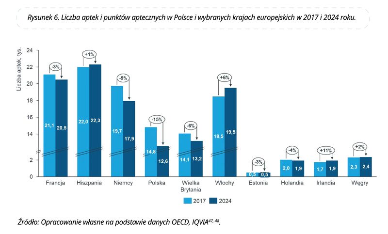 Wykresy słupkowe powinny zaczynać się od zera? To zacznijmy od zera, tylko usuńmy trochę środka! Zabieg zastosowany na tym wykresie jest niestety dość popularny, ale zdecydowanie niepolecany. Mimo że zostaliśmy ostrzeżeni, że z osią Y coś jest nie w porządku (ukośne linie), to w dalszym ciągu zupełnie zaburza to percepcję różnic. I to podwójnie: liczby aptek w pierwszych sześciu krajach wydają się mniejsze niż w rzeczywistości oraz mniejsze są różnice między latami 2024 i 2017.