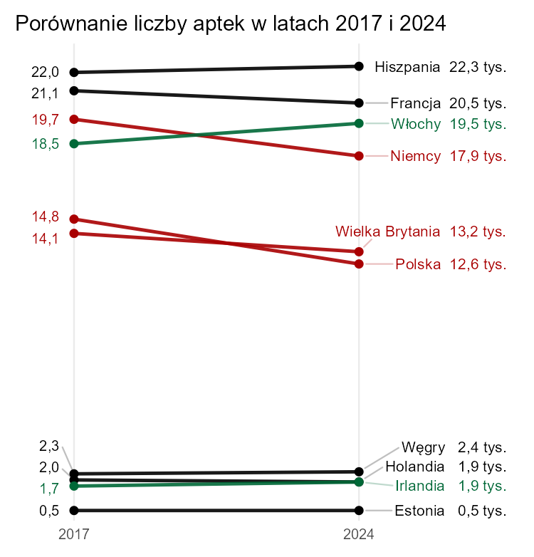 Jak to zrobić inaczej? Można po prostu nie manipulować długością słupków, ewentualnie przedstawić jak niżej. Dodatkowo zaznaczyłem kolorem czerwonym kraje, w których liczba aptek spadła (o co najmniej 5%), na zielono te, w których wzrosła (o co najmniej 5%) i na czarno pozostałe.