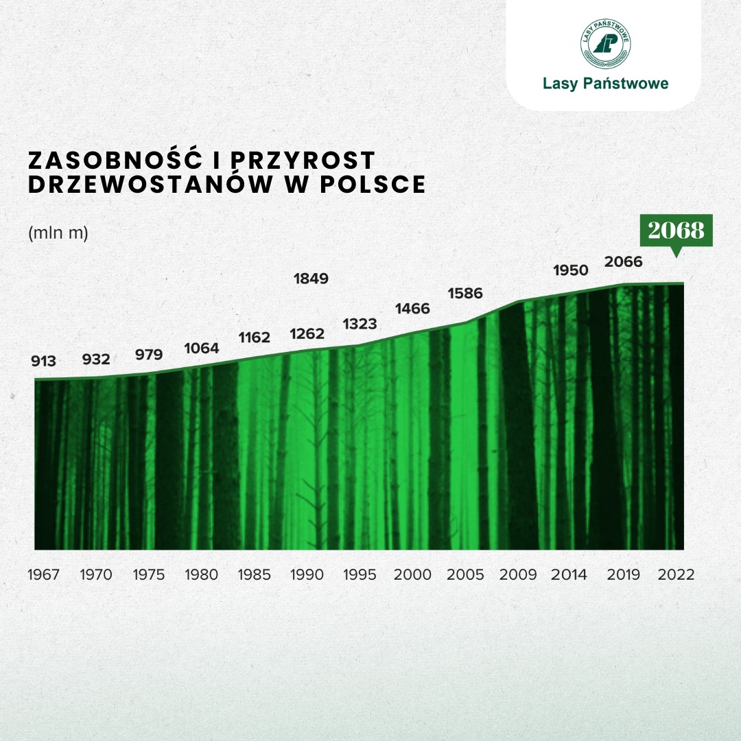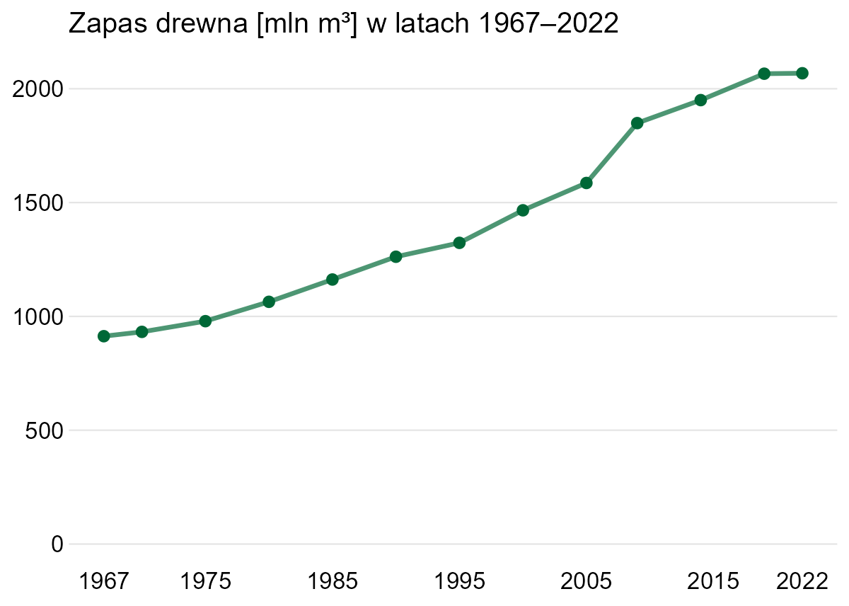 Poprawiłem też oś X, bo nie jest w równych odstępach, mimo że to sugeruje pierwotny wykres (pierwszy i ostatni przedział są trzyletnie). Oprócz tego zasobność drzewostanu to objętość drewna na danym obszarze i jednostką jest metr sześcienny na hektar. Na wykresie podano zapas drewna.