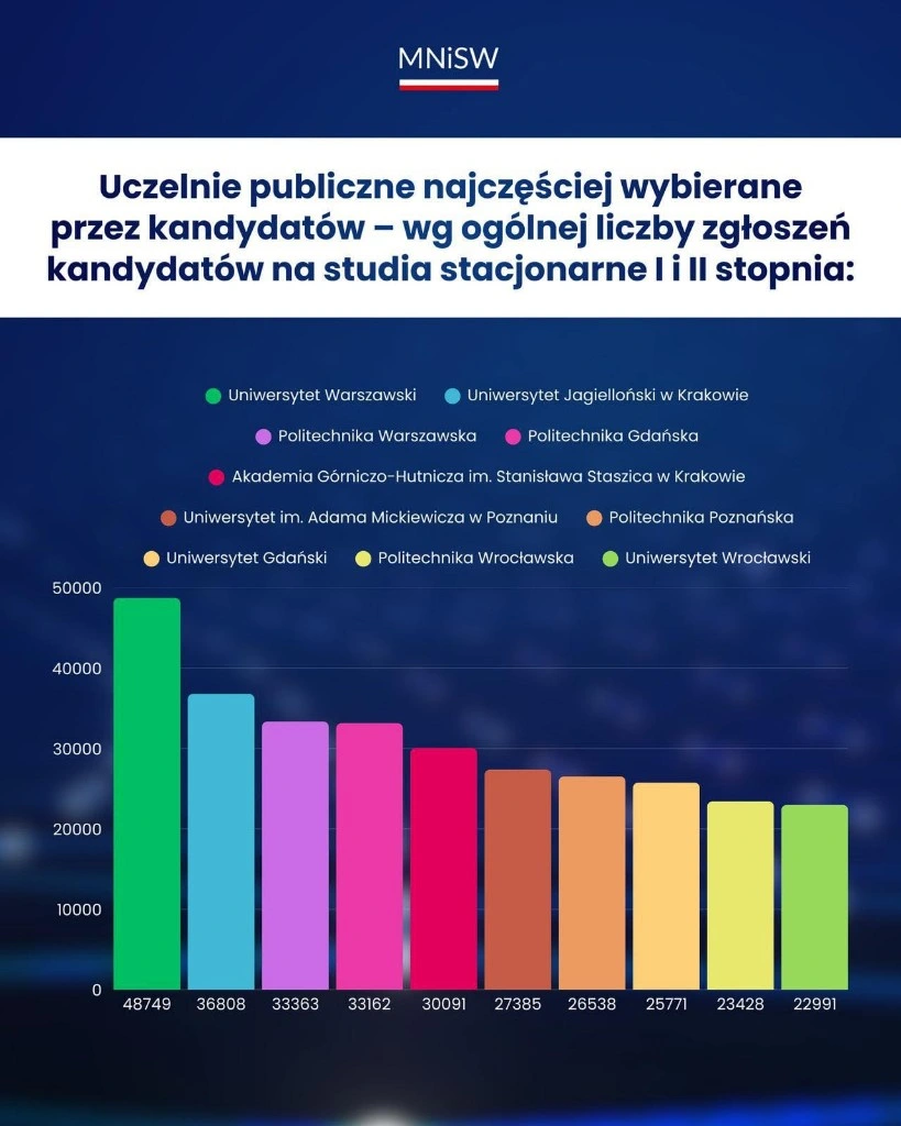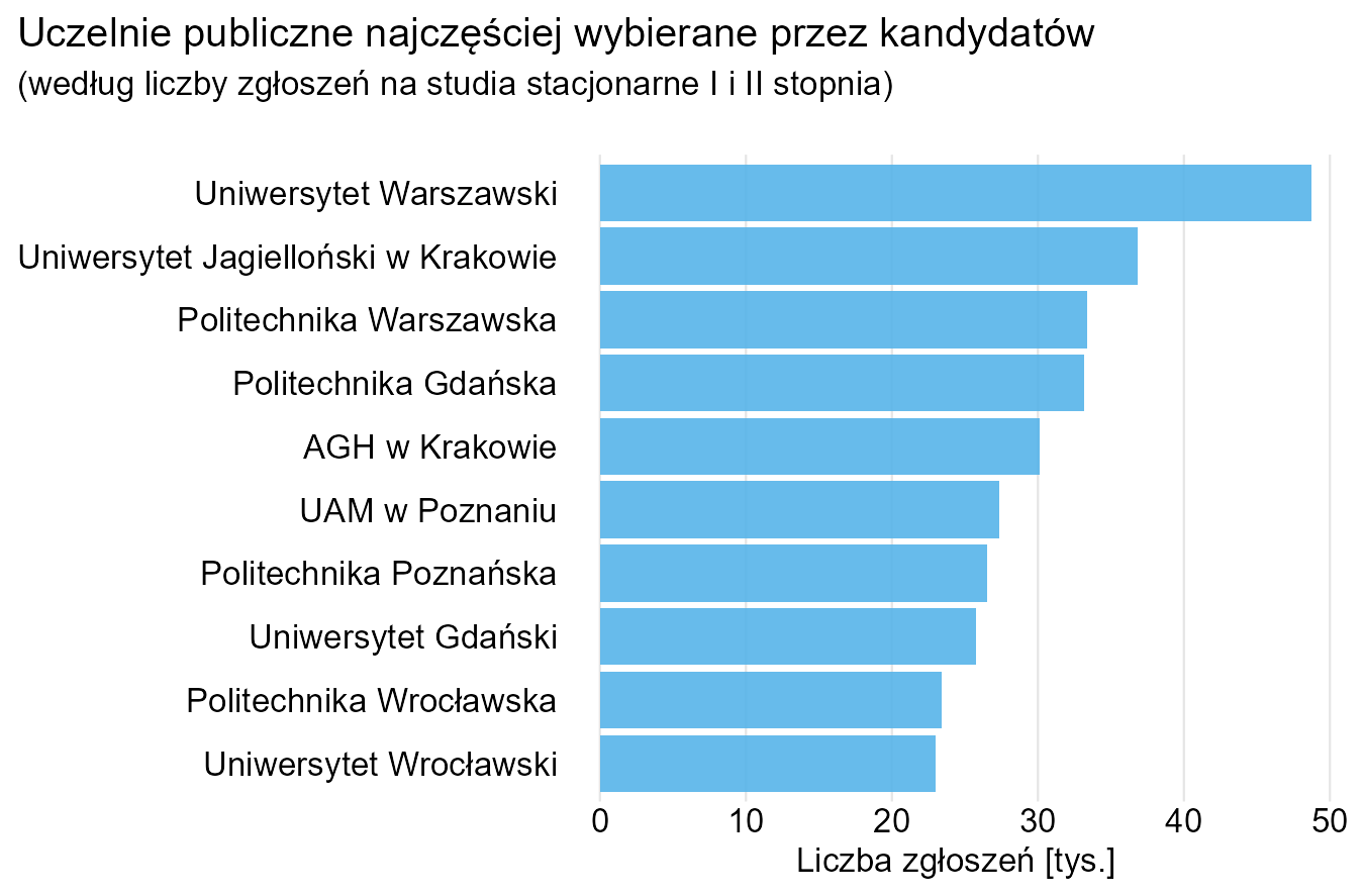 Zaczynamy od wykresu słupkowego z dość specyficznymi etykietami na osi X. Zamiast nazw uczelni pojawiają się tu dokładne wartości z osi Y. Domyślam się, że autorzy mieli problem z długimi nazwami, ale trudno o gorsze rozwiązanie. Całe szczęście, że kolejność w legendzie odpowiada tej na osi X, inaczej ciężko byłoby stwierdzić, który słupek odpowiada na przykład Politechnice Wrocławskiej, a który Uniwersytetowi Gdańskiemu (bardzo podobne kolory).