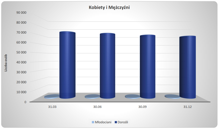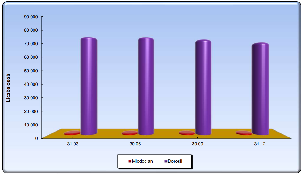 Jak ten wykres poprawić poza rezygnacją z trójwymiarowości? Moim zdaniem, najlepiej zrezygnować ze wszystkiego. Wykresy powinny być wartością dodaną, a tu nie widzę żadnej. W raporcie jest tabela z dokładnymi liczbami i to całkowicie wystarcza. To znaczy takie dane wciąż może być warto zaprezentować na wykresie, ale dodając więcej informacji, na przykład dłuższy okres. Proponowałbym też przedstawić liczbę młodocianych na niezależnym wykresie, z osobną skalą osi Y.
