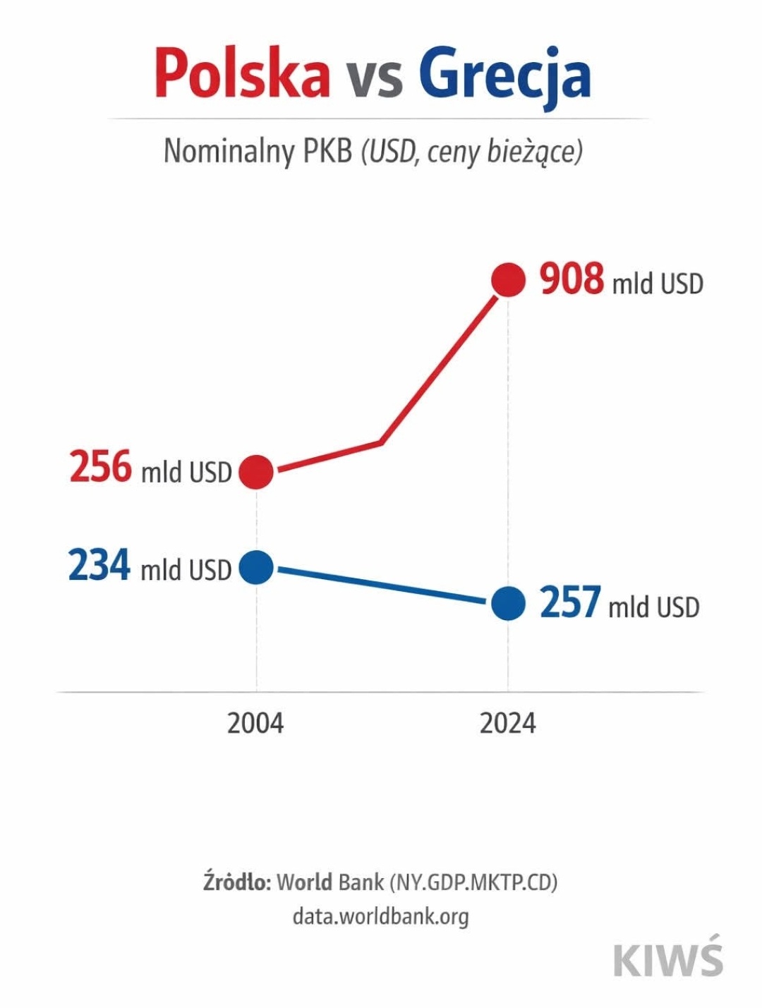 Tym razem PKB Polski tak bardzo wzrosło, że aż zaburzyło kolejność liczb naturalnych i 257 jest mniejsze od 234. To niestety jeden z wielu przykładów wykresów generowanych przez modele językowe (można to rozpoznać choćby po słowie „bieżące”). Poniżej kolejny.