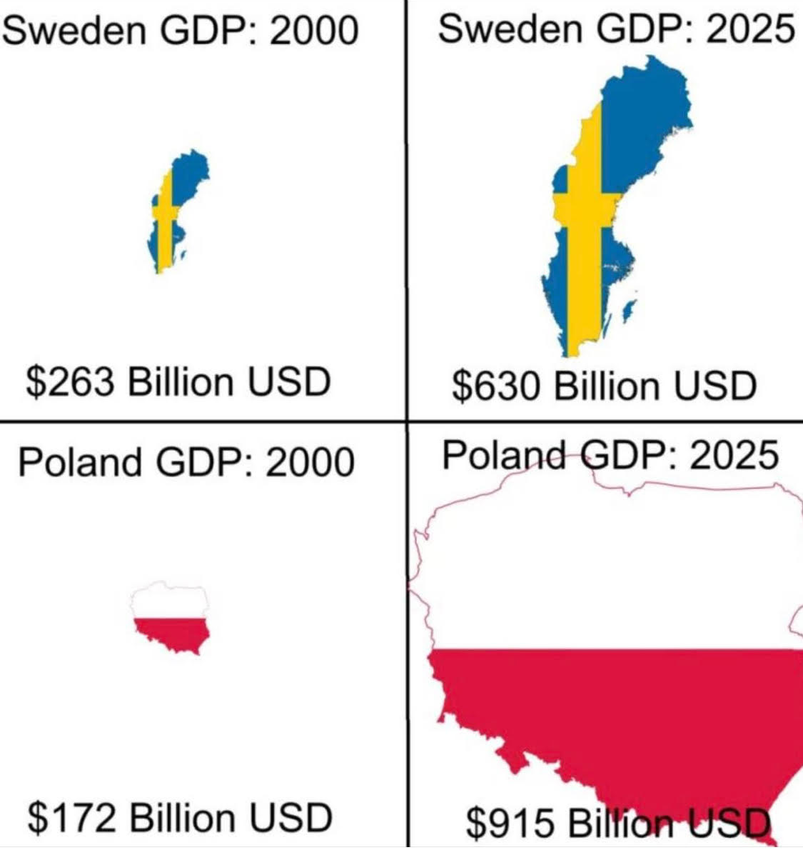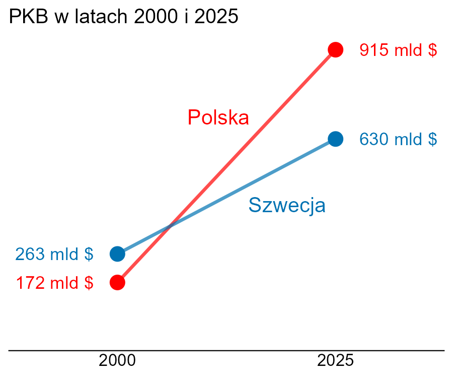Przy okazji warto wspomnieć, że wykres spotkał się z mocną krytyką na portalach społecznościowych, ale najczęściej niesłuszną. Zarzucano mu, że przecież w Szwecji żyje znacznie mniej ludzi, więc takie porównanie nie ma sensu. Zamiast tego powinno się podać PKB per capita, czyli dzielone przez liczbę mieszkańców. Ale liczby mieszkańców zmieniły się nieznacznie między latami 2000 i 2025, a wykres pokazuje głównie WZROST PKB, a nie same wartości. Nie ma znaczenia, czy podzielimy je przez stałą (nawet jeśli będzie różna dla Polski i Szwecji), względny wzrost będzie taki sam. Oprócz tego, w niektórych zastosowaniach to SUMA (czyli PKB) może mieć większe znaczenie od ŚREDNIEJ (PKB per capita).