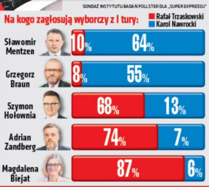 Jeśli teraz pomalujemy szare paski na niebiesko, to proporcje będą się mniej więcej zgadzać. „Mniej więcej”, bo w przypadku Szymona Hołowni nawet dorzucenie szarego paska nie wystarczyło (na wykresie Super Expressu niebieski jest jeszcze dłuższy).