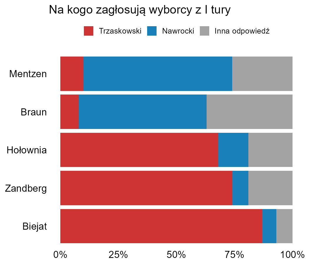 Ten wykres na pierwszy rzut oka jest zły, bo sumy procentów są dla każdego kandydata inne. Jak zaraz zobaczymy, wcale nie jest zły – ale fatalny.