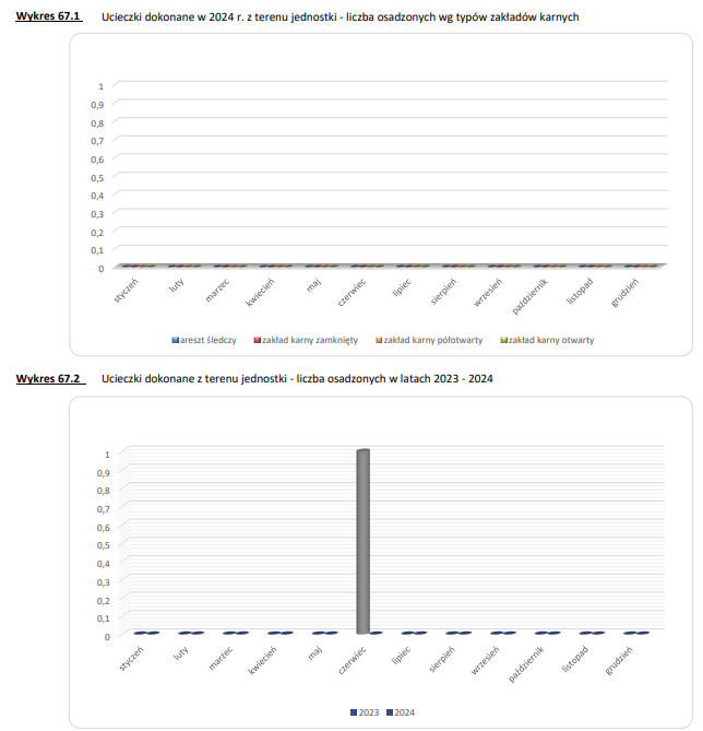 Cóż, jeśli chodzi o same dane, wygląda to bardzo dobrze! Sprawdziłem dołączone w raporcie tabele i rzeczywiście, całkowita liczba ucieczek w 2024 wyniosła zero. Autorzy postanowili przedstawić to na wykresie, z rozbiciem na miesiące i miejsca, z których więzień uciekł. Całe szczęście, że na pierwszym użyto formy trójwymiarowej, inaczej niczego nie byłoby widać! Zabawnie wyglądają też ułamki na osi Y, sugerujące możliwość ucieczki połowy więźnia.