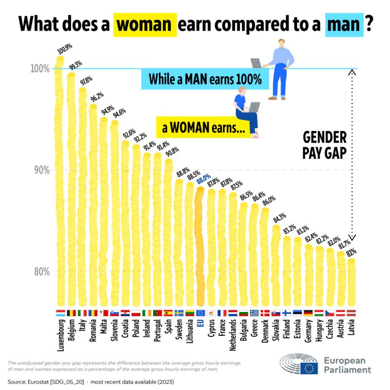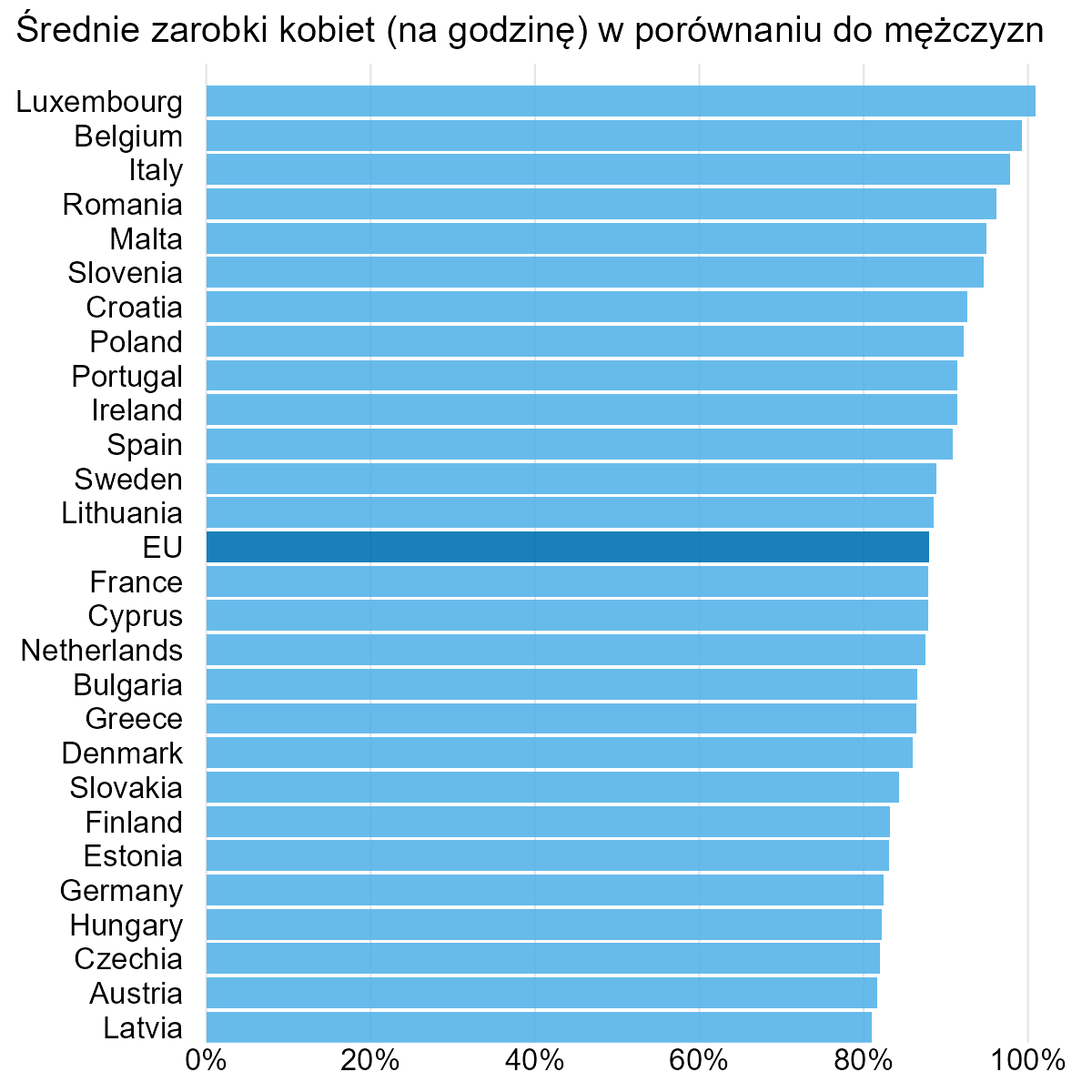 Drugi problem z tym wykresem jest taki, że pokazuje lukę płacową przy pomocy strzałki. Jak się ma jej wielkość do słupka dla Łotwy? Jest kilka razy dłuższa, co nie ma sensu.