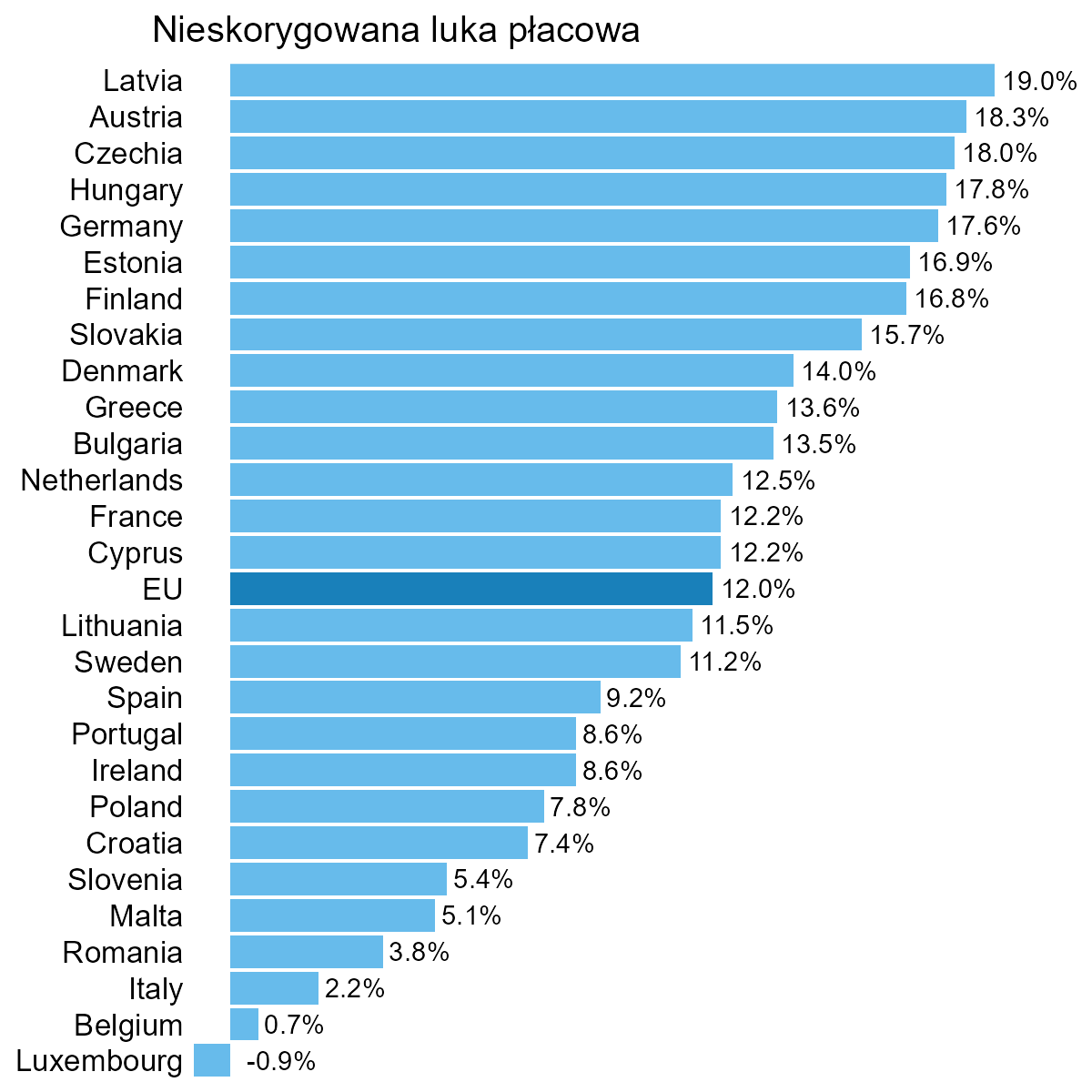 A co zrobić, jeśli chcemy bardziej skupić uwagę odbiorcy na różnicach między krajami? Moim zdaniem najlepiej przedstawić samą lukę płacową, jak niżej.