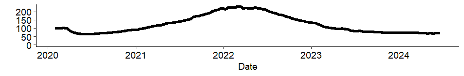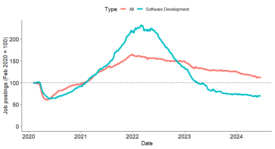 Spójrzmy na ten wykres, który swego czasu był dość popularny w internecie. Jest to liczba ofert pracy w USA w sekcji „software development” (specjalnie nie tłumaczę na polski, później się do tego odniosę). Na osi Y liczba ofert, ale tak przeskalowana, by w lutym 2020 wynosiła 100. Oryginalny wykres tutaj (może różnić się od tego poniżej, bo jest stale aktualizowany).