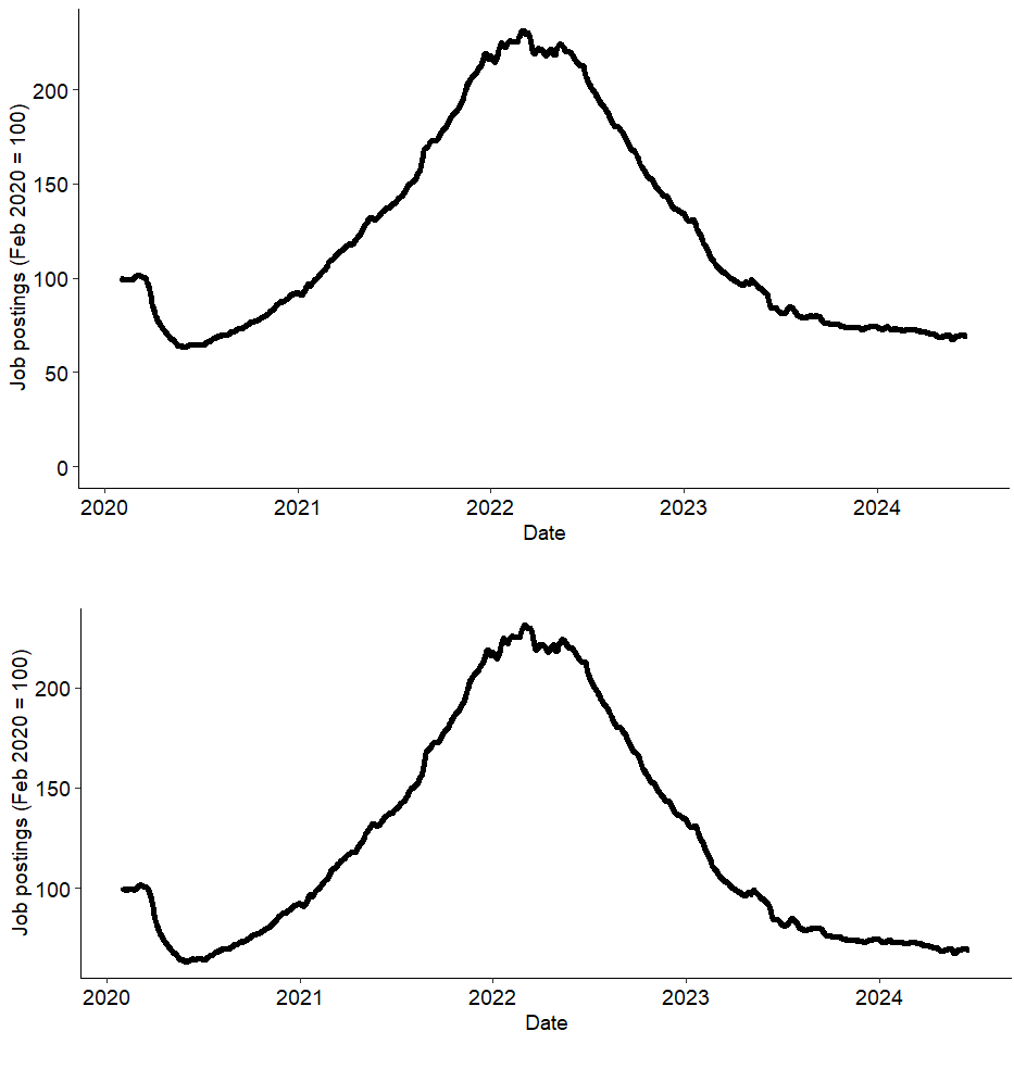 Wróćmy do przedstawionego wykresu. Głównym problemem jest to, że może się wydawać, że w połowie 2020 i na początku 2024 liczba ofert spadł do zera. Czy jednak poza tym faktem, jest tu jakiś problem z percepcją? Czy gdyby oś Y zaczynała się od zera, to wzrost i spadek ofert pracy wydawałby się mniejszy?